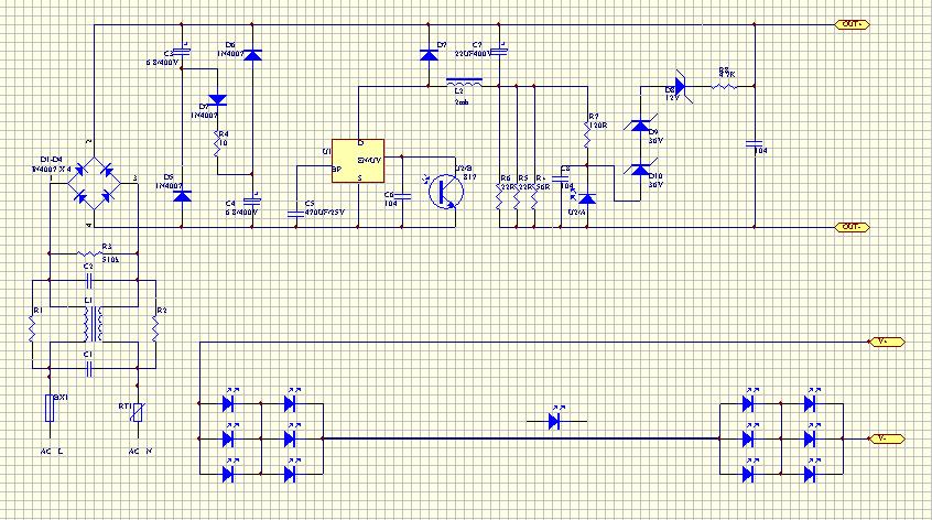 10.LED燈的選用及結(jié)構(gòu)組合,采用小功率直插草帽白燈,單燈功率為0.06W,特征電流為20ma,VF=3.2-3.4V,單燈亮度為6LM,燈板組合:24串,6并,串聯(lián)后燈組的電壓為76.8-81.6v,共用144個LED燈,最大功率為8.64W。