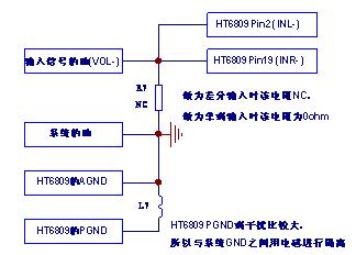 2、 HT6809的GND與輸入信號(hào)的負(fù)端不相連。HT6809的GND應(yīng)該與系統(tǒng)的GND相連,而與輸入信號(hào)的負(fù)端不相連。這樣可以避免回路噪聲的產(chǎn)生。下圖為標(biāo)準(zhǔn)的各GND連接方法: