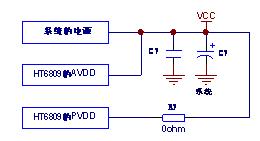 3、 HT6809的VDD端布線注意事項(xiàng):HT6809的PVDD腳干擾較大,為了不干擾HT6809的AVDD,PVDD取從系統(tǒng)總電源處(電源入口)取電,電源入口處有大電容可以對(duì)PVDD產(chǎn)生的紋波進(jìn)行濾波,濾波后再把電源供給AVDD和系統(tǒng)上其他需要電源的地方。下圖為示意圖:
