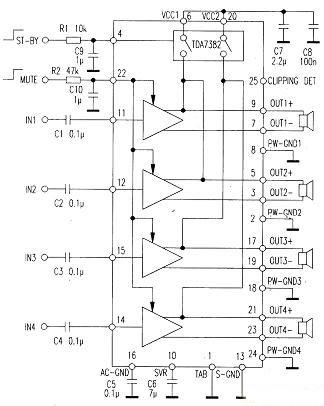 TDA7382 是意法半導(dǎo)體公司新推出不久的汽車用 AB 類功放集成電路,它采用 25 腳單列FLEXIW ATT 封裝。內(nèi)有 4 路22W PNP/NPN 互補晶體管構(gòu)成的橋式 AB 類音頻功率放大器,是高檔汽車?yán)硐氲亩嗦暤拦Ψ偶呻娐罚?strong>其應(yīng)用電路見上圖。