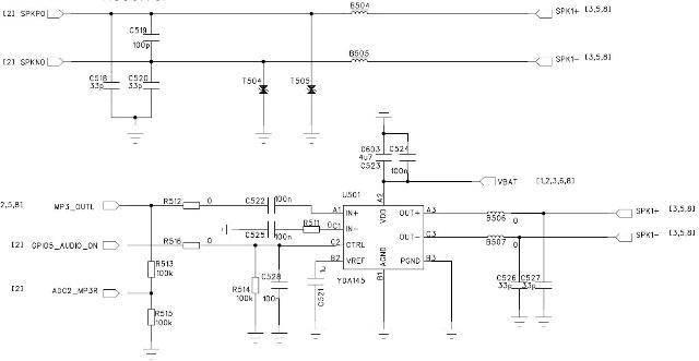 在手機(jī)與綜測(cè)儀連接時(shí),開(kāi)啟免提(音頻功放YDA145打開(kāi)),射頻指標(biāo)(調(diào)制譜,頻相誤差,接收靈敏度)嚴(yán)重變差導(dǎo)致連接中斷。去掉speaker使YDA145輸出開(kāi)路時(shí),情況依舊(干擾程度變大,射頻指標(biāo)更易受干擾)。但當(dāng)免提音量降低時(shí)(減小YDA145輸入信號(hào)幅度)射頻指標(biāo)不再受影響。B506,B507都為600ohm@100MHz 磁珠,R512為75Kohm電阻R522,C526,C527都為1000pF電容。