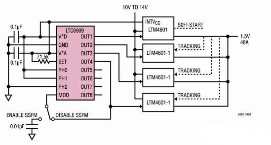 硅振蕩器為多相、擴頻開關穩(wěn)壓器時鐘提供了一個理想的平臺。除了具有一個板上時鐘發(fā)生器之外,這些固態(tài)器件還能將擴頻調制與多相輸出組合起來。考慮到這一點,凌力爾特公司開發(fā)出了LTC6909(圖1),這是一款具有8個單獨多相輸出的精準擴頻硅振蕩器。單個電阻器負責在12.5kHz至6.67MHz的范圍內選擇輸出頻率。三個邏輯輸入用于設定輸出相位關系(范圍從45°至120°),從而允許LTC6909為多達8個相位提供同步?梢詥⒂靡环N偽隨機擴頻調頻,頻率擴展量在中心頻率的±10%。用戶可選擇3種調制速率之一,以確保調制速率不超過穩(wěn)壓器的帶寬。此外,LTC6909還具有一個創(chuàng)新的濾波器,該濾波器負責跟蹤SSFM調制速率并在頻率轉換之間提供平滑處理。