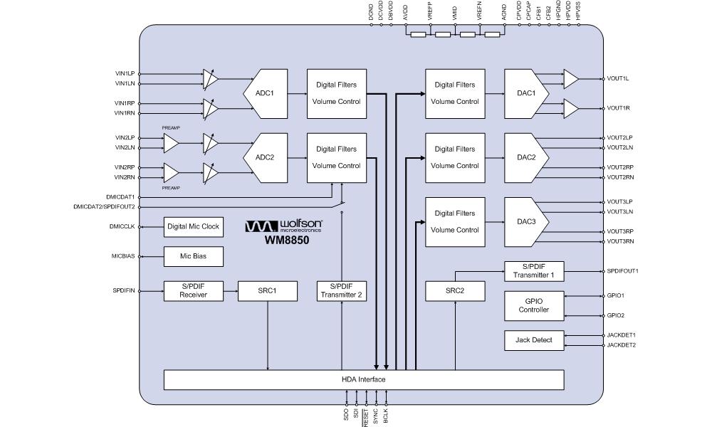 這兩款器件都和業(yè)界標(biāo)準(zhǔn)的高清晰度音頻接口完全兼容,并且符合視窗硬件質(zhì)量實(shí)驗(yàn)室(WHQL)的規(guī)范。WM8850帶有三個(gè)高性能的立體聲數(shù)字模擬轉(zhuǎn)換器(DAC),能夠?qū)崿F(xiàn)六個(gè)通道的高清晰度音頻,是5.1多通道環(huán)繞聲音頻系統(tǒng)的理想之選;同時(shí),WM8860集成了兩個(gè)高性能的立體聲DAC,能夠?qū)崿F(xiàn)四個(gè)通道的高清晰度音頻。隨之附帶的軟件可確保高級(jí)應(yīng)用場(chǎng)景、低功耗運(yùn)行和基于Windows7的音頻框架,同時(shí)也支持Windows Vista、XP 和 Linux。而核心部分正是歐勝的Audio Studio,它為可用性和特色性能建立了新的基準(zhǔn),此外還嵌入了歐勝的SoundStage聲效引擎。