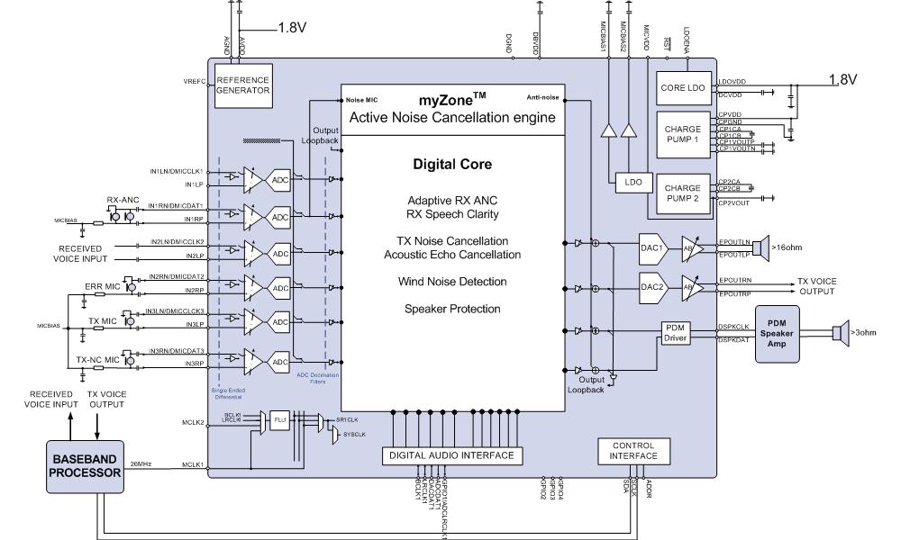 Tx噪聲消除將手機(jī)麥克風(fēng)捕獲的背景噪聲降到了最低,并只發(fā)送主叫方的聲音,噪聲抑制能力高達(dá)32dB。而在受話方,手機(jī)里的Rx噪聲消除將可提供高達(dá)20dB的噪聲抑制,其工作原理是偵測任何外部噪聲并產(chǎn)生一個(gè)同樣大小的反向信號(hào)來中和背景噪聲,因此受話方將只聽見主叫方的聲音。該器件在窄帶和寬帶語音通話都可以使用。