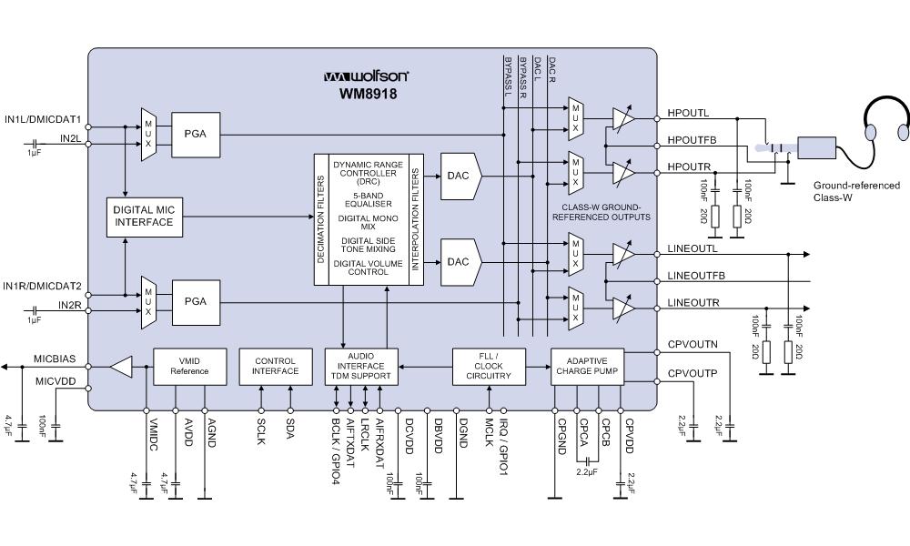 WM8918以立體聲接地參考耳機(jī)放大器為特色,它采用了歐勝W類放大器和一個(gè)創(chuàng)新的雙模電荷泵架構(gòu)來(lái)改善回放期間的效能和功耗,通過(guò)去除了對(duì)交流耦合電容器的需求來(lái)減少電路板的面積、原料成本以及改善低音響應(yīng)。