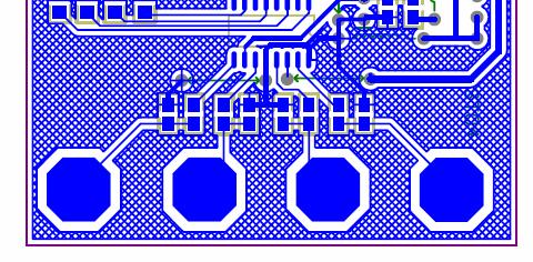 (7)鋪地 :觸摸IC及其相關(guān)的外圍電路要用45°網(wǎng)格鋪地,網(wǎng)格中銅的面積大概應(yīng)該占總面積的60%。連線周圍20MIL不能鋪地。感應(yīng)盤和鋪地至少要有1.5mm的距離。感應(yīng)盤正對(duì)的背面不允許鋪地,也不允許有任何大面積的銅箔和其他信號(hào)線。