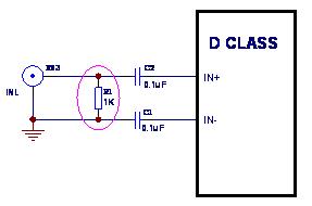 (5) 在信號輸入端對GND加一個1KΩ 電阻可以明顯降低系統(tǒng)電流聲及Pop聲。連接方式見下圖: