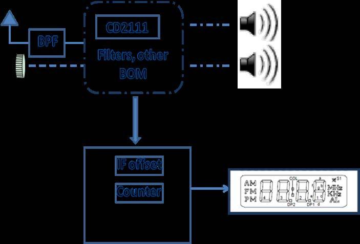 傳統(tǒng)模擬收音機IC可以用于輪調數顯收音機設計。然而,由于AM/FM接收器模擬架構的局限性,信號處理主要由芯片外的其他元件完成,因此接收器IC需要較高的BOM成本。此外,由于模擬IC并不能為顯示驅動器提供調諧頻率信息,在這些傳統(tǒng)的收音機方案中,需要一個中頻(IF)計數器IC通過本地振蕩器脈沖來估算調諧頻率并傳輸給顯示驅動器,由顯示驅動器顯示所計算出的調諧頻率,如圖2所示。