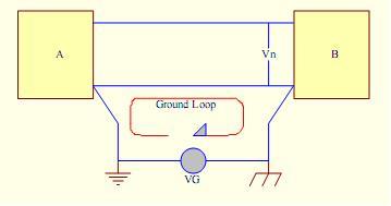 如上圖,一個(gè)在二個(gè)不同地點(diǎn)接地的系統(tǒng),在接地點(diǎn)之間有電位差(如地線上的電阻加上車載設(shè)備的大電流就是產(chǎn)生這種情況),這種情況下在電路中就會(huì)產(chǎn)生一個(gè)有害的噪聲電壓(表現(xiàn)出來(lái)就是喇叭中出現(xiàn)的電流聲)。噪聲電壓和信號(hào)水平之比的大小很重要,如果信噪比使電路的正常工作愛(ài)到影響,就必須采取一定的措施了。