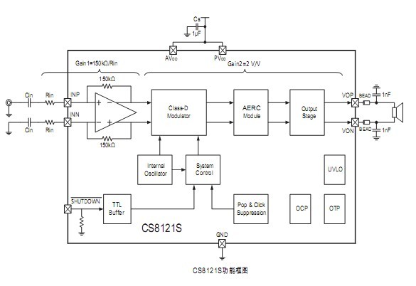 CS8121是一款4歐姆4瓦的Class D 音頻功放集成電路。采用特殊的高壓CMOS工藝,具有極寬的工作電壓范圍(2.4V-6.5V),極限值為7V。