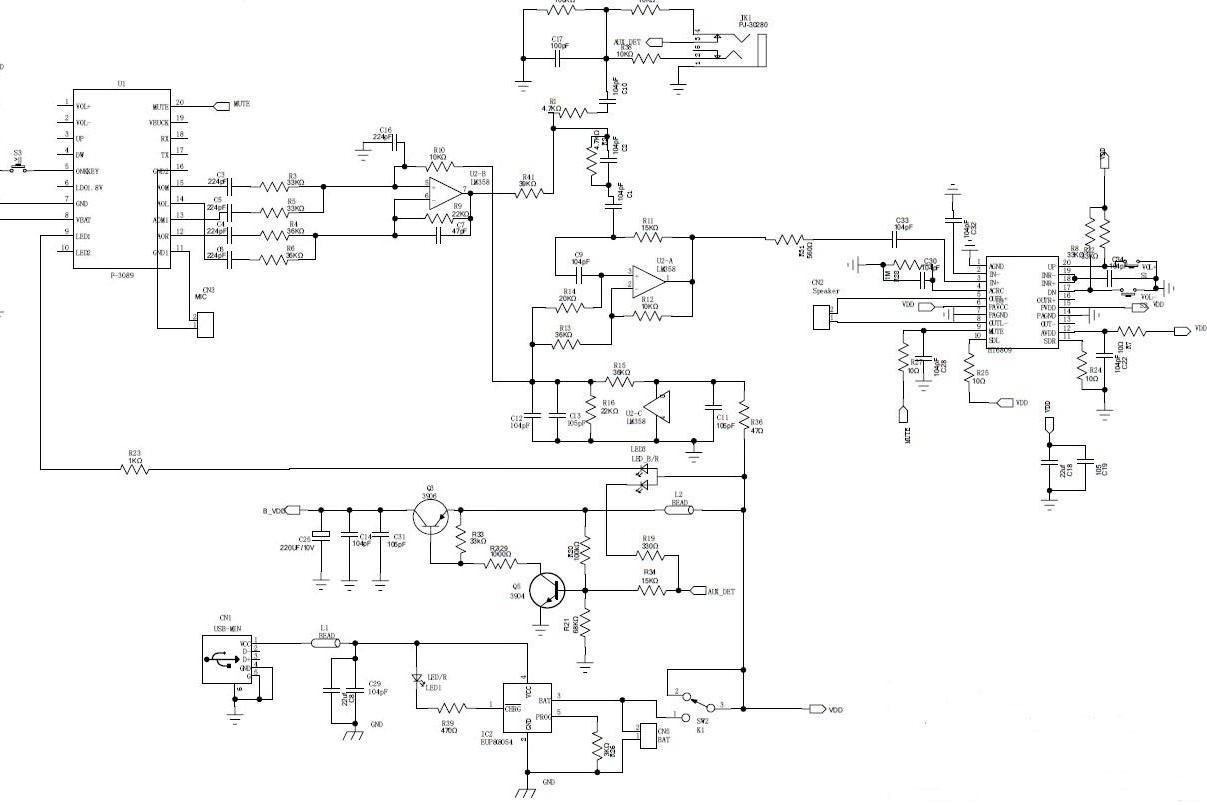 上圖為比較典型藍牙小音箱設計原理圖,其主要器件為:
