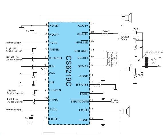 .若不需要音量調(diào)節(jié)功能,則將VOLUME、SEMAX端接電源,SEDIFF端接地,此時(shí)對(duì)應(yīng)的BTL的增益為20dB,耳機(jī)增益為14dB.