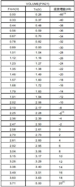 VOLUME腳調(diào)節(jié)BTL模式的音量。例如:當(dāng)VDD=5V,通過變阻器調(diào)節(jié)VOLUME電壓=2.95V,則BTL下的增益為6dB(具體增益對(duì)應(yīng)的電壓點(diǎn)請查表1)。