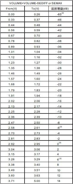 SEDIFF腳調(diào)節(jié)耳機(jī)模式的音量。耳機(jī)音量大小取決于VOLUME腳、SEDIFF腳的電壓差。例如:當(dāng)VDD=5V時(shí),VOLUME電壓=2.95V,SEDIFF電壓=1V,則耳機(jī)增益為-18dB(具體增益對(duì)應(yīng)的電壓點(diǎn)請查表2)。.此腳對(duì)BTL模式無效