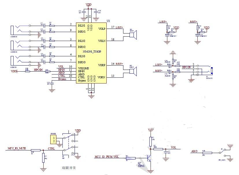 電源開關(guān)打開,功放電源管腳接通電源以后至少保持CTRL管腳(pin20(TSSOP20封裝))低電平1s以上。才能打開功放,對(duì)其進(jìn)行通道選擇。所以: ①.功放CTRL管腳必須接下拉電阻。這樣在電源開關(guān)打開以后,即使主控MCU還沒(méi)受控,CTRL管腳也保持低電平。②MCU運(yùn)行起來(lái)以后,首先就讓CTRL管腳低電平。1u以上時(shí)間以后,再對(duì)功放進(jìn)行初始化通道選擇。示意圖如下: