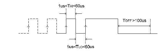 加在CTRL管腳的一線脈沖高電平寬度(THI)要求1us<THI<60us。低電平寬度(TLO)要求1us<TLO<60us。進(jìn)入SHUTDOWN模式低電平保持時(shí)間(TOFF)要求 TOFF>100us。如下圖: