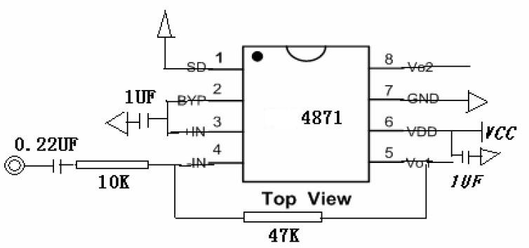 2: LM4871管腳三(同相輸入端)是接1UF電容到地,HT6873的同相輸入端(INP)要接與INN匹配的輸入電阻、電容,構(gòu)成差分輸入,如圖4所示。