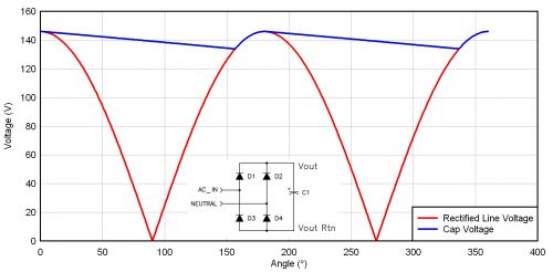 圖 1 和圖 2 顯示了離線電源中使用的兩種整流器配置結(jié)構(gòu)。圖 1 為一個全波橋接,其中,AC 輸入電壓經(jīng)過簡單整流以后便被送至電容。這種電路常見于寬范圍 AC 和 230 伏 AC 應(yīng)用中。電容充電至正弦波峰值,然后在大部分半周期放電。電容紋波電流包括兩個部分:首先是充電周期,其電流由電容值和所應(yīng)用的 dV/dt 決定;其次是電容放電。電源起到恒定電源負載的作用,因此電容以非線性速率實施放電,其計算方法為:W = ½ * C *V^2 = P * dt。