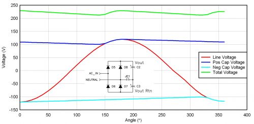 圖 2 描述了一種倍壓器整流配置結(jié)構(gòu),許多 115/230 VAC 應(yīng)用都使用了這種結(jié)構(gòu)。如果您有一個 230 VAC 應(yīng)用,則您的輸入級需要處理最大輸入電壓(265 VAC)乘以峰值因數(shù)這么大的電壓,其接近 400 伏。在與一個 115 VAC 輸入一起使用時,倍壓器將經(jīng)過整流的電壓,增壓至接近 230 VAC 輸入電平。我們可以專為 230 VAC 線壓設(shè)計一個電源,以此來減小電源工作的整流后電壓范圍。我們通常使用一個跳線或者開關(guān),來實現(xiàn)不同整流器配置之間的切換。這種方法的唯一缺點是偶爾出現(xiàn)人為倍增 230 VAC 輸入的情況,從而對電源造成嚴(yán)重破壞。圖 2 顯示了倍壓器電路的一些波形。電容之間不帶電。兩個整流器交替對每個電容施加輸入電壓。一個周期中,每個電容都被充電至峰值線壓,這樣它們每個都有一個線頻率紋波部分。由于電容為異相位充電,因此其和的紋波頻率為線頻率的兩倍。