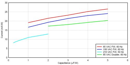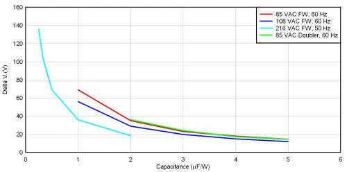 圖 3 顯示了四種整流器/輸入電壓方法的 uF/W 標(biāo)準(zhǔn)化壓降。共有三種全波橋接方法,適用于低線壓美國(108 VAC/60 Hz)、低線壓日本(85 VAC/50 Hz)和低線壓歐洲(216 VAC/50 Hz)。另外,還有一個低線壓日本的倍壓器。就全波橋而言,標(biāo)準(zhǔn)化過程只需將電容除以功率。在倍壓器中,標(biāo)準(zhǔn)化方法是將兩個串聯(lián)電容之一的電容除以功率。要想使用該曲線圖,請首先確定您的整流器配置結(jié)構(gòu),并選擇一個可以接受的壓降。之后,您只需讀取輸入電容的 uF/W 便可。最后,通過乘以您的功率,便可去標(biāo)準(zhǔn)化。