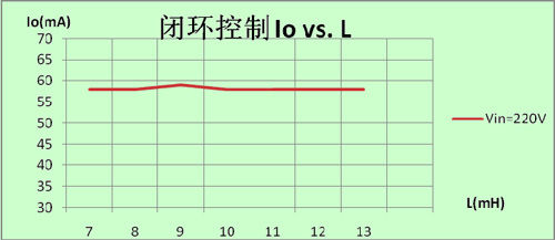 圖4可見,線性調(diào)整率為0,因?yàn)槿]環(huán)控制逐周期精確控制,輸入有任何變化,芯片會(huì)馬上檢測(cè)到并作相關(guān)的調(diào)整以便得到同樣的輸出;同理,如圖5及圖6,當(dāng)輸出電壓變化,電感量變化時(shí),芯片也會(huì)作相關(guān)的調(diào)整;正是因?yàn)槲覀兊娜]環(huán)高精度恒流控制方法,使電源做到了真正的恒流。這樣,量產(chǎn)的一致性可以控制到小于±1%。