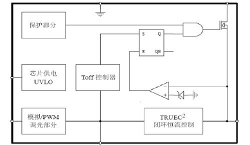 所謂開環(huán),不以檢測(cè)到的輸出電流值來做發(fā)出PWM信號(hào)的參考。所謂的閉環(huán),即真正檢測(cè)輸出電流值,以此為標(biāo)準(zhǔn)來發(fā)出PWM信號(hào)。從電路拓?fù)渖,二者沒有區(qū)別。但是在芯片內(nèi)部對(duì)檢測(cè)到的如圖1 CS腳電感電流信號(hào),做專利技術(shù)處理,如圖2 TRUEC2部分。這樣,就檢測(cè)到了電感電流的平均值,也就是輸出電流的平均值。芯片針對(duì)檢測(cè)到的值,控制輸出占空比,實(shí)現(xiàn)了閉環(huán)控制。