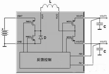 為了按照公式6分配電量,系統(tǒng)就需要增加兩個(gè)開關(guān)MOS1和MOS2,如圖3所示。當(dāng)MOS1導(dǎo)通 時(shí),線圈內(nèi)貯存的電量就會(huì)傳送到輸出1;當(dāng)MOS2導(dǎo)通時(shí),線圈內(nèi)貯存的電量就會(huì)傳送到輸出2。MOS1和MOS2以類似于PMOS和NMOS的1/T頻 率反相開關(guān),而占空比D2.不同于PMOS和NMOS的D1?梢哉f占空比D1是測(cè)量系統(tǒng)能夠傳輸?shù)目傠娔艿臉?biāo)準(zhǔn),而占空比D2則是測(cè)量?jī)蓚(gè)輸出之間分配 的總電能的標(biāo)準(zhǔn)。值得注意的最重要因素是,該系統(tǒng)只需一個(gè)線圈。