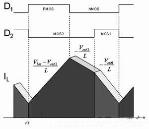 圖4是雙輸出拓?fù)渚圈電流的波形。與傳統(tǒng)的降壓轉(zhuǎn)換器不同,雙輸出拓?fù)溆腥齻(gè)主要相位:(Vbat-Vout2)/L上升斜率;-Vout2/L下降斜率;-Vout1/L下降斜率。
