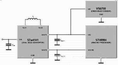 STn8810多媒體應(yīng)用處理器 (NOMADIK)以及STV0984 + VS6750圖像處理器和200萬像素CMOS圖像傳感器的共性是,數(shù)字核心電壓(VCORE)與I/O引腳電源電壓(VIO)的要求不同。圖7是一個(gè) CMOS相機(jī)應(yīng)用的電路示意圖,VCORE電壓(1.2 V)供給數(shù)字核心STV0984,而VIO電壓(1.8V)用于供給VS6750以及STV0984的I/O結(jié)構(gòu)。這樣的布局設(shè)計(jì)使得應(yīng)用電路板的尺寸極 其緊湊。 |