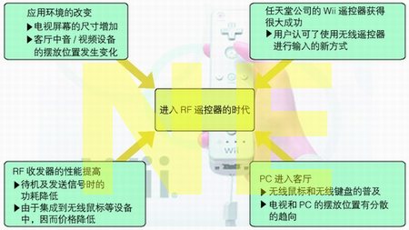 首先,客廳中電視的使用狀況發(fā)生了變化;其次,任天堂公司的家庭游戲機(jī)Wii所采用的RF遙控器獲得了很大成功;再次,可以聯(lián)網(wǎng)的電視逐漸普及,市場對(duì)于鼠標(biāo)或鍵盤等輸入設(shè)備的需求量增加;最后,用于RF遙控器的無線收發(fā)器的性能迅速提升。這些變化導(dǎo)致RF遙控器走向?qū)嵱谩?/font>
