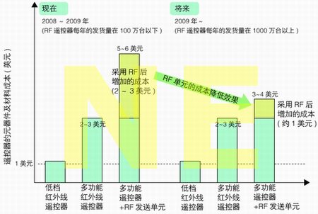 在RF遙控器發(fā)貨量不大的情況下,RF收發(fā)器也難以依靠量產(chǎn)降低成本,所以,RF遙控器的元器件及材料成本將居高不下。據(jù)某遙控器生產(chǎn)廠商的工程師推測(cè):“RF遙控器的元器件及材料成本暫時(shí)是多功能紅外線遙控器的元器件及材料成本的2倍~3倍(見圖4)。”