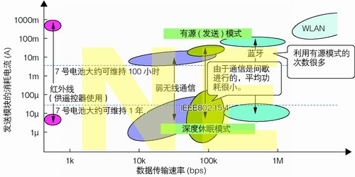 在藍(lán)牙2.1+EDR標(biāo)準(zhǔn)中,修改的不是物理層,而是MAC層的控制信號(hào)協(xié)議。藍(lán)牙消耗電流大的原因,并不是在待機(jī)或發(fā)送時(shí)的消耗電流的絕對(duì)值特別大。藍(lán)牙中深度休眠模式下的消耗電流只有10mA左右,和IEEE 802.15.4標(biāo)準(zhǔn)并沒有太大差別(見圖6)。