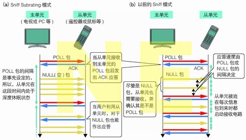 新的藍(lán)牙標(biāo)準(zhǔn)把用于連接確認(rèn)的檢測(cè)(POLL)包與其它的信息包明確區(qū)別開來,并規(guī)定從單元對(duì)POLL包以外的信息包可以保持深度休眠模式。據(jù)藍(lán)牙SIG介紹,這樣一來,消耗電流的平均值就會(huì)下降到以前的1/5以下。而且,延遲時(shí)間不會(huì)變長。