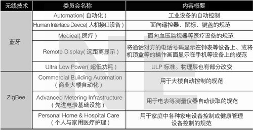 所謂下一代遙控器,以電視使用的RF遙控器為例,就是用于控制立體聲設(shè)備、手表、照明燈具、空調(diào)、門口的監(jiān)視攝像頭或警報(bào)器等家庭安全設(shè)備和醫(yī)療設(shè)備的遙控器?梢哉f,遙控器可以實(shí)現(xiàn)整個(gè)家庭的自動(dòng)控制。ZigBee和藍(lán)牙兩個(gè)陣營都正在制定關(guān)于下一代遙控器的通信標(biāo)準(zhǔn)(見表4)。