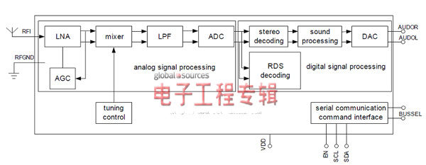 第一階段是模擬信號(hào)處理階段,該階段負(fù)責(zé)將RF天線信號(hào)轉(zhuǎn)換為一個(gè)較低的中頻(IF)數(shù)字信號(hào)。自動(dòng)增益控制單元(AGC)將低噪聲RF放大器(LNA)保持在其線性工作范圍內(nèi)。混頻器用于將接收到的RF信號(hào)下變頻為較低的中頻(IF)信號(hào)。而ADC將信號(hào)轉(zhuǎn)換為數(shù)字格式。在數(shù)字域內(nèi)完成FM解調(diào)。此外,數(shù)字信號(hào)處理器也用于處理RDS數(shù)據(jù)。