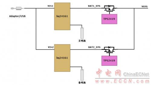 圖 1 基于bq24161+TPS2419 的雙電池供電方案框圖