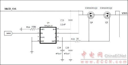 EN 引腳為TPS2419 的使能控制,為了最大限度的減小系統(tǒng)待機(jī)時(shí)候的靜態(tài)電流,當(dāng)系統(tǒng)處于待機(jī)條件下OREN1 信號(hào)拉低,TPS2419 處于不使能狀態(tài),靜態(tài)電流可以維持在最小,此時(shí)系統(tǒng)的供電經(jīng)過(guò)肖特基二極管D2 來(lái)提供。