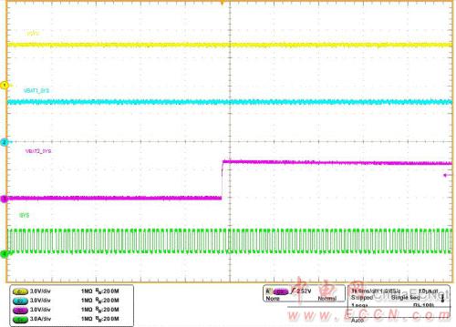 備電不在位,主電提供系統(tǒng)電壓VSYS,VBAT1_SYS>VBAT2_SYS 條件下插入備電。過(guò)程中不存在主電、備電切換供電過(guò)程,測(cè)試VSYS 電壓的穩(wěn)定性以及備電對(duì)主電通路的影響; 備電不在位,主電提供系統(tǒng)電壓VSYS,VBAT1_SYSVBAT2_SYS,拔出備電。過(guò)程中不存在主電、備電切換供電過(guò)程,測(cè)試VSYS 的穩(wěn)定性以及備電對(duì)主電通路的影響; 備電在位,備電提供系統(tǒng)電壓VSYS,VBAT1_SYS下面分為靜態(tài)負(fù)載電流以及動(dòng)態(tài)負(fù)載電流兩種情況,在不同工作條件下測(cè)試系統(tǒng)電壓VSYS的穩(wěn)定性以及VBAT1_SYS 與VBAT2_SYS 之間是否相互影響,其中:CH1-VSYS,CH2-VBAT1_SYS,CH3-VBAT2_SYS,CH4-ISYS。