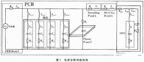 電源分配網(wǎng)絡(luò)通常由如圖1所示的結(jié)構(gòu)組成,其中包括:穩(wěn)壓器(Voltage Regulator Module,VRM)、去耦電容器(Decoupling Capacito r)、電路板平面(Plane)、電路板上的擴(kuò)散電感和電阻以及BCA過孔。