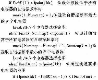 (2)確定設(shè)計頻段的最高頻率點(diǎn),即截止頻率FHF.(3)將設(shè)計頻段在對數(shù)坐標(biāo)下平均劃分為N段,N依賴于電容器最大種類數(shù)。代碼實現(xiàn)為: