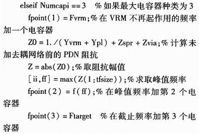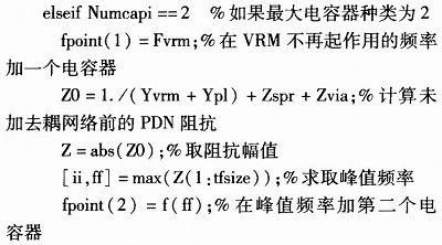 (1)確定VRM不再能提供低阻抗時的頻率點(diǎn),作為設(shè)計頻段的起點(diǎn)FLF.代碼實現(xiàn)為: