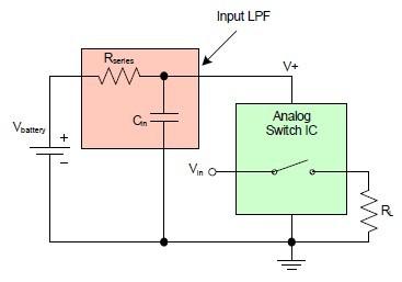 當(dāng)音頻元件的DC 電源轉(zhuǎn)換開(ON)關(guān)(OFF)時(shí),由于變化的電源電壓轉(zhuǎn)換速率(slew rate)的緣故,揚(yáng)聲器或耳機(jī)的電壓可能出現(xiàn)反跳(bounce)。盡管電源旁路(by-pass)電容有助于減少一個(gè)元件電源引腳上的噪聲尖峰,如圖1 所示,將低通濾波器(LPF)構(gòu)建在V+引腳之上的技術(shù)可以進(jìn)一步減少電源引腳的瞬變。在IC 的Vbattery 電源引腳和V+引腳之間放上一個(gè)串聯(lián)電阻RSeries,就構(gòu)成了一個(gè)帶有去耦電容Cin 的低通濾波器(LPF)。由于Intersil 的音頻開關(guān)IC 消耗的電源電流≤10μA,這個(gè)解決方案很有效,在大小適當(dāng)時(shí),可以使串聯(lián)電阻兩端的電壓降忽略不計(jì)。這個(gè)LPF 可將DC 電壓的快轉(zhuǎn)換速率瞬變轉(zhuǎn)換成IC 電源引腳上較慢的指數(shù)斜率。較慢的斜坡電壓可以最大限度地減少電源的開關(guān)瞬變,同時(shí)消除開關(guān)輸出端所有的注入電荷,這些電荷會(huì)導(dǎo)致負(fù)載上的雜音。