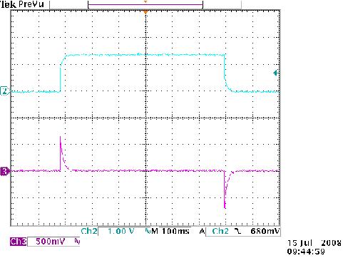 圖7中的雜音分流電路采用了ISL54406。100ms的延遲時(shí)間可以在開關(guān)打開將音頻驅(qū)動(dòng)器連接到揚(yáng)聲器負(fù)載之前,將開關(guān)輸入完全放電到0V。當(dāng)開關(guān)在時(shí)間延遲之后打開時(shí),可以看出負(fù)載上的瞬態(tài)電壓可忽略不計(jì),從而消除了雜音。