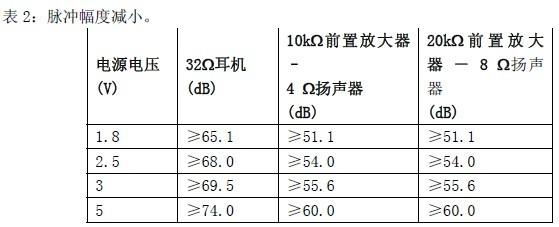 重要的是,應(yīng)注意在脈沖持續(xù)時(shí)間超過(guò)大約10ms時(shí),“嘶嘶聲”和“破音”會(huì)出現(xiàn)在每一個(gè)脈沖轉(zhuǎn)換上(即上升或下降)。對(duì)于0.6μs到10ms范圍的瞬態(tài)脈沖寬度,“嘶嘶聲”和“破音”的出現(xiàn)非常接近,以致聲音的出現(xiàn)被認(rèn)為是同時(shí)的。如表1所示,脈沖幅度的減小必須消除雜音,表示為dB并基于50%音頻放大器電源電壓偏置的瞬態(tài)脈沖幅度,如下面的表2所示。