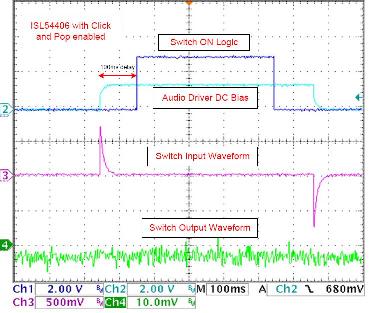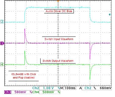 圖6顯示了具有雜音分流電路禁用功能的ISL54406的輸入和輸出波形。當(dāng)音頻驅(qū)動(dòng)器打開,兩端的隔直流電容器上的瞬態(tài)電壓直接與開關(guān)輸出耦合?煽吹綋P(yáng)聲器對(duì)DC瞬態(tài)放電在開關(guān)輸入,從而引起雜音。