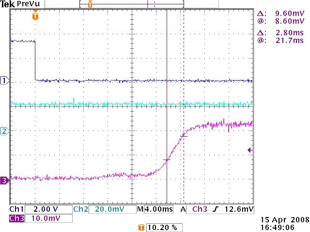 圖8突出顯示了集成了軟啟動(dòng)開關(guān)的ISL54405器件。一個(gè)外部軟起動(dòng)電容可用來(lái)改變開關(guān)的開啟時(shí)間,限制開關(guān)輸出轉(zhuǎn)換速率。圖9和圖10顯示了具有軟啟動(dòng)禁用功能的ISL54405器件。利用開關(guān)輸入端20mV的DC信號(hào),開啟開關(guān)產(chǎn)生一個(gè)輸出,將轉(zhuǎn)換速率提升至1000V/s以上。圖11顯示了具有軟啟動(dòng)開啟功能ISL54405器件。利用軟啟動(dòng)功能,現(xiàn)在開關(guān)輸出的轉(zhuǎn)換速率不到5V/s,這符合雜音消除標(biāo)準(zhǔn),見表1。