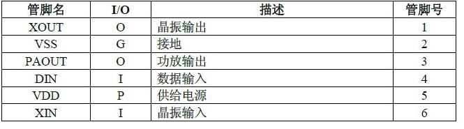 •  自動待機(jī)功能,當(dāng) DIN 無信號輸入,電路自動待機(jī)進(jìn)入小于 1uA 的節(jié)電狀態(tài)