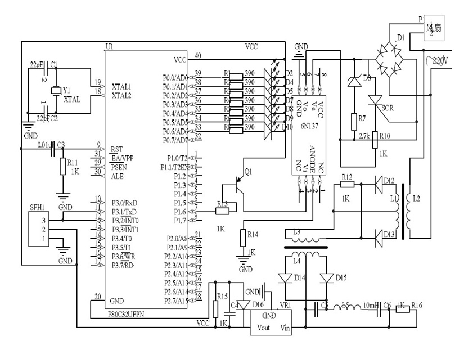 風扇調(diào)速電路主要由橋式電路D1、光電耦合器6N137、SCR可控硅、三極管Q1等組成。PIC16F873A單片機產(chǎn)生可控硅控制的移相脈沖,通過改變相角實現(xiàn)導通角的改變,進90而改變輸出的電路的電壓,控制電扇的電機轉(zhuǎn)動。當導通角為0時電機停轉(zhuǎn),導通角越大,風扇轉(zhuǎn)速越快。P1.6為低電平時Q1導通,6N137光耦導通進而控制風扇轉(zhuǎn)機電路。由于數(shù)字電平上下跳變時集成電路耗電發(fā)生突變,容易引起電源產(chǎn)生毛刺,通常對開關(guān)電源影響比線性電源大,因為開關(guān)電源在開關(guān)周期內(nèi)不能響應電流突變,而僅由電容提供電流的變化部分。一般數(shù)字電路越復雜,數(shù)據(jù)速率越高,累積的電流跳變越強烈,高頻分量越豐富。采用95光耦有利于降低噪聲的干擾,提高信噪比。