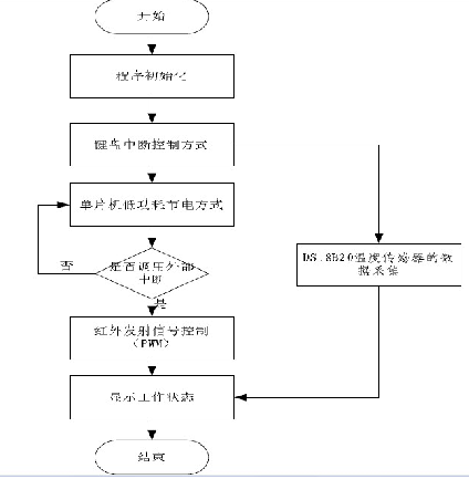 PIC16F873A控制軟件在MPLAB環(huán)境下用C語言開發(fā)。在系統(tǒng)設計中首先要對系統(tǒng)進行初始化:A/D轉(zhuǎn)換、IO口設置等。在該系統(tǒng)軟件主要實現(xiàn)對鍵盤的中斷方式掃描、對100DS18B20溫度傳感器的數(shù)據(jù)采集、紅外發(fā)射信號脈沖的控制、PWM編碼、液晶顯示器顯示控制以及工作狀態(tài)指示燈控制等[7]。如圖4所示為遙控信號發(fā)射系統(tǒng)程序流程圖。