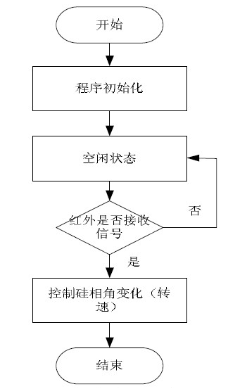 在該系統(tǒng)中依然采用PIC16F873A單片機作為控制核心芯片。該系統(tǒng)軟件主要實現(xiàn)對紅外信號控制接收、處理信號控制風扇轉(zhuǎn)速(控制相角變化)、指示燈的控制等。如圖5所示信號接收系統(tǒng)程序流程圖。